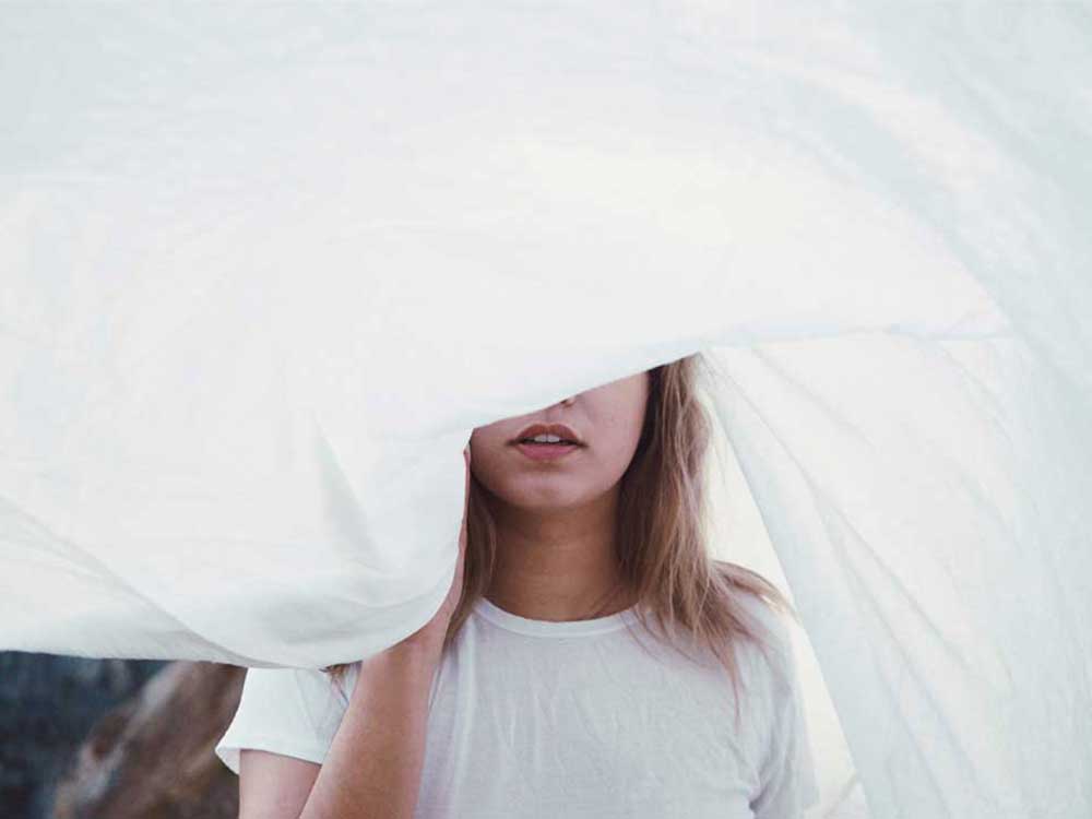 Girl with face covered by sheet